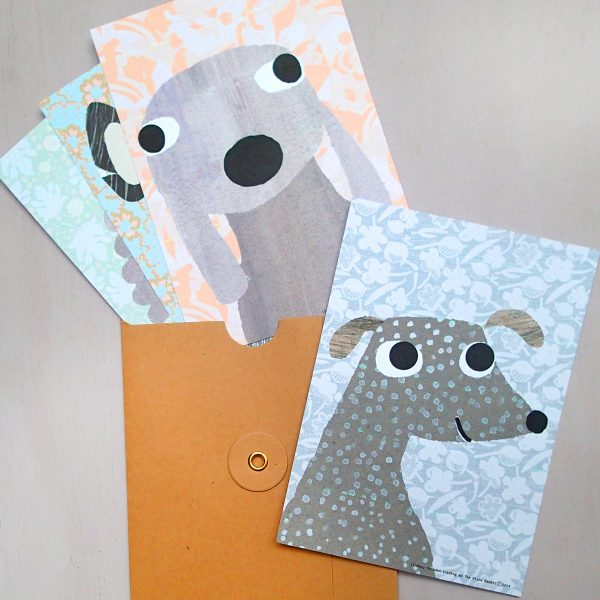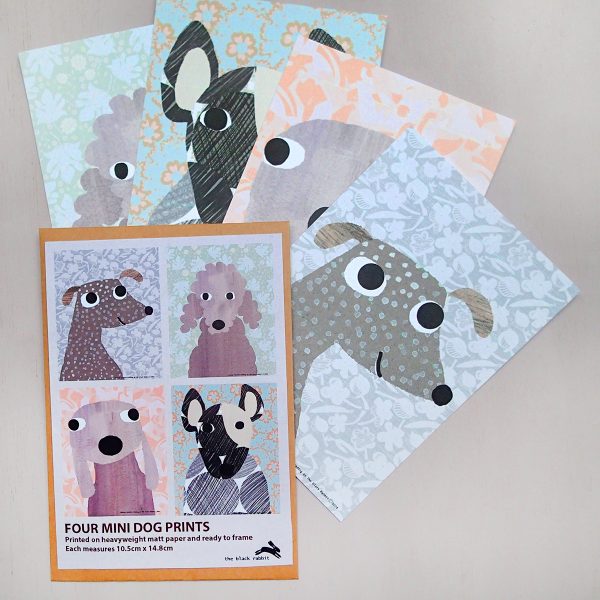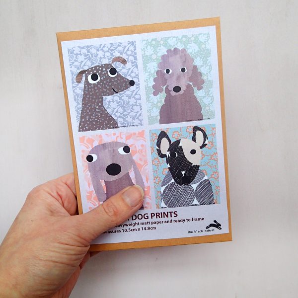 A pack of four prints of friendly dogs from original artwork by Lindsay Marsden, printed on lovely heavyweight recycled paper. The pooches are surrounded by beautiful floral patterns that will look great in your home. They make a brilliantly postable gift.
